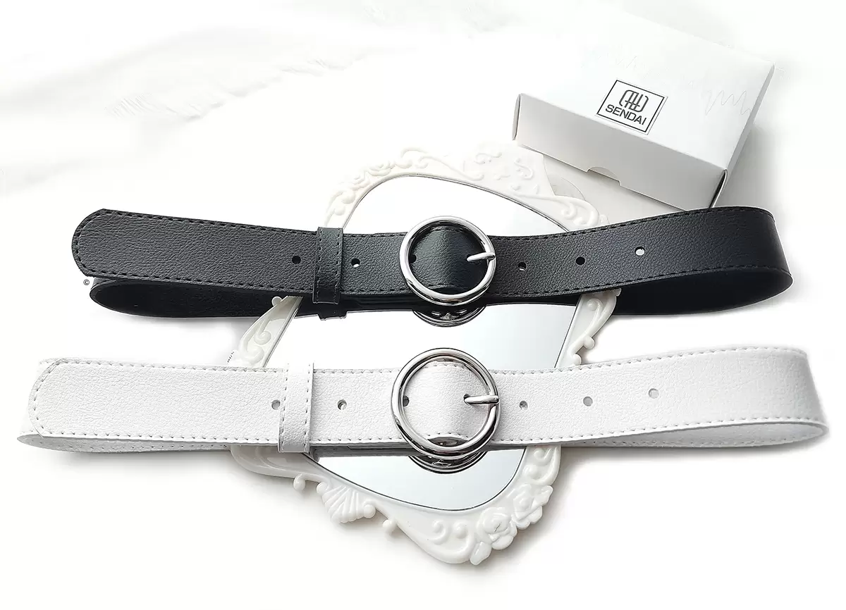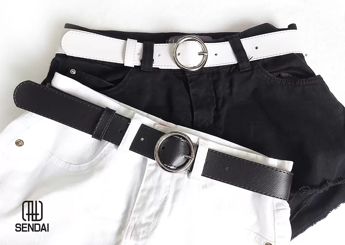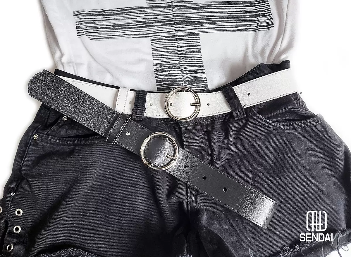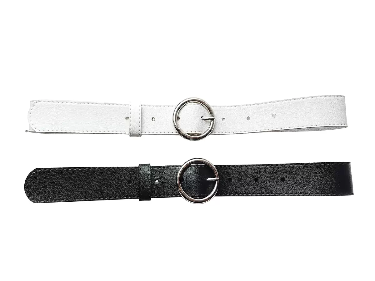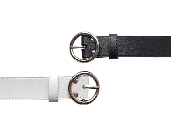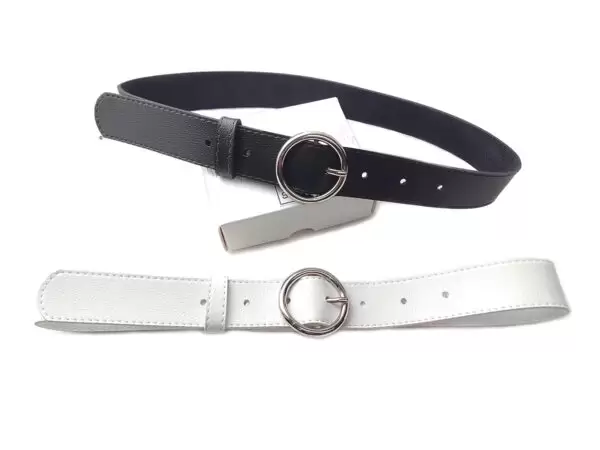 CONTEÚDO DO KIT: 2 CINTOS –> 1 PRETO E 1 BRANCO COM FIVELA REDONDA PRATEADA